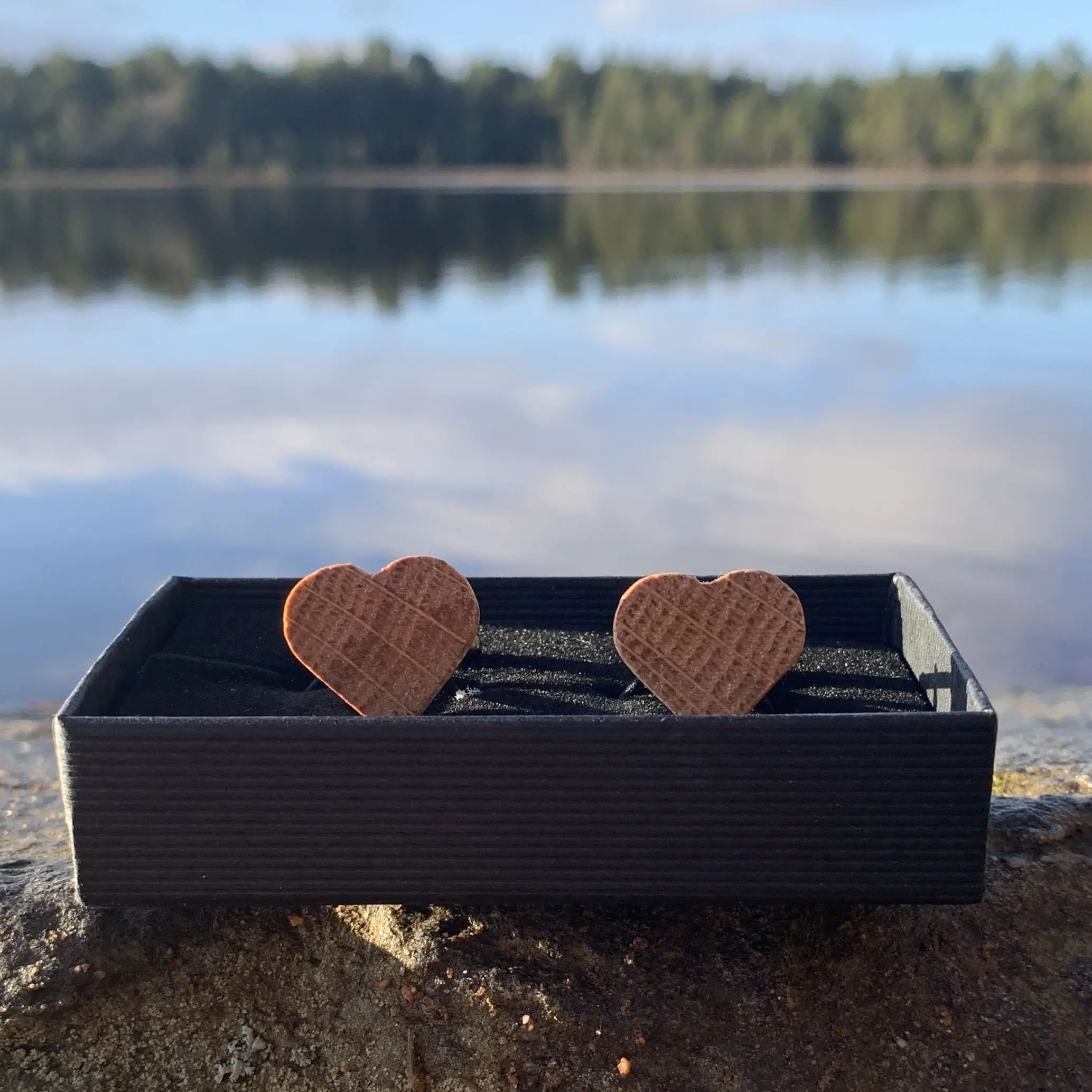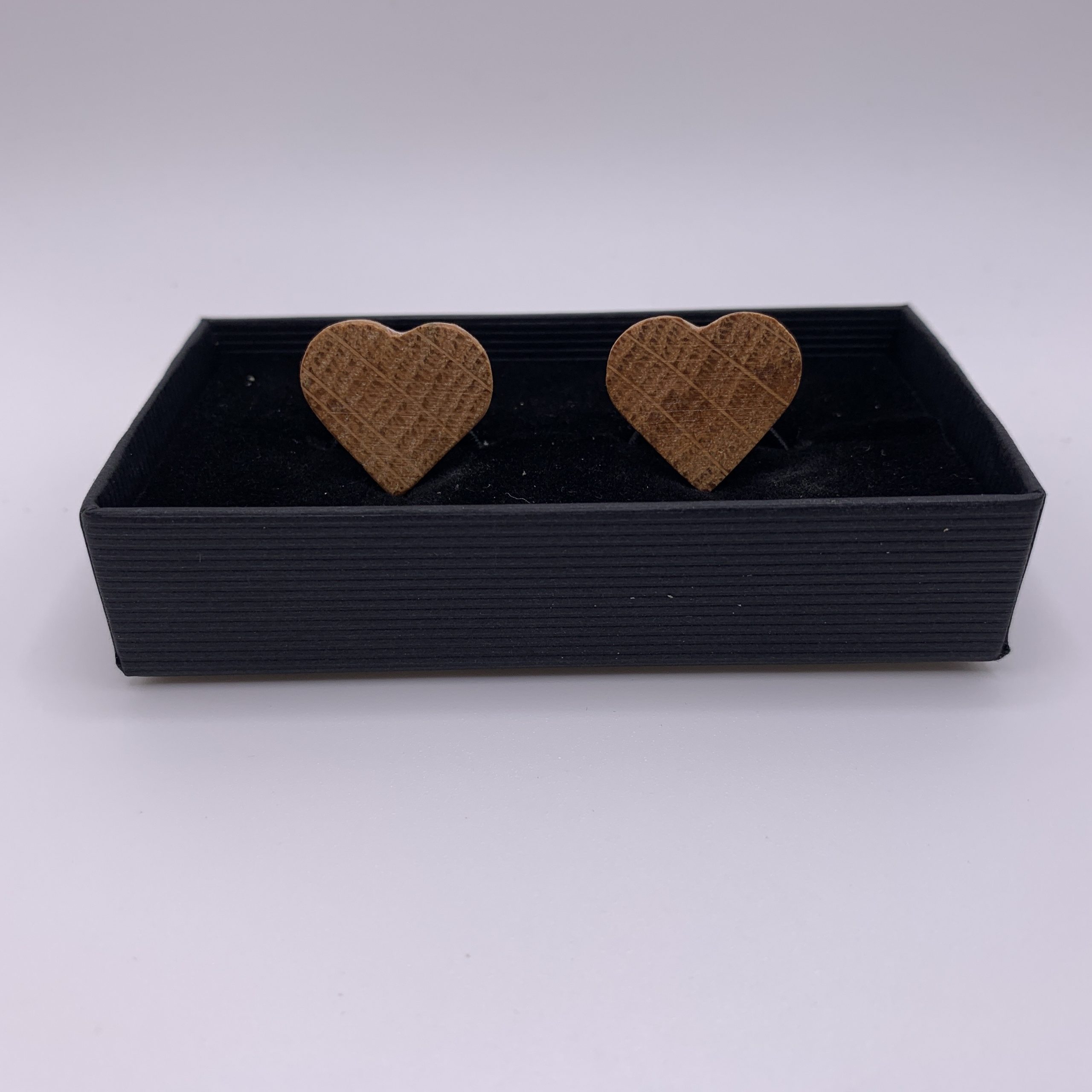 A unique pair of heart shaped wooden cufflinks handcrafted from a reclaimed oak whisky stave.