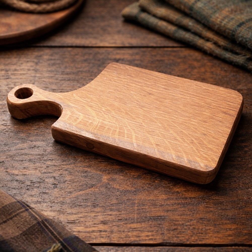 The solid oak board, once part of a maturing whisky cask, brings rich grain patterns, warm tones and subtle markings that reflect its previous life in the distillery. Carefully shaped and hand-finished, the board is compact yet practical, making it ideal for: