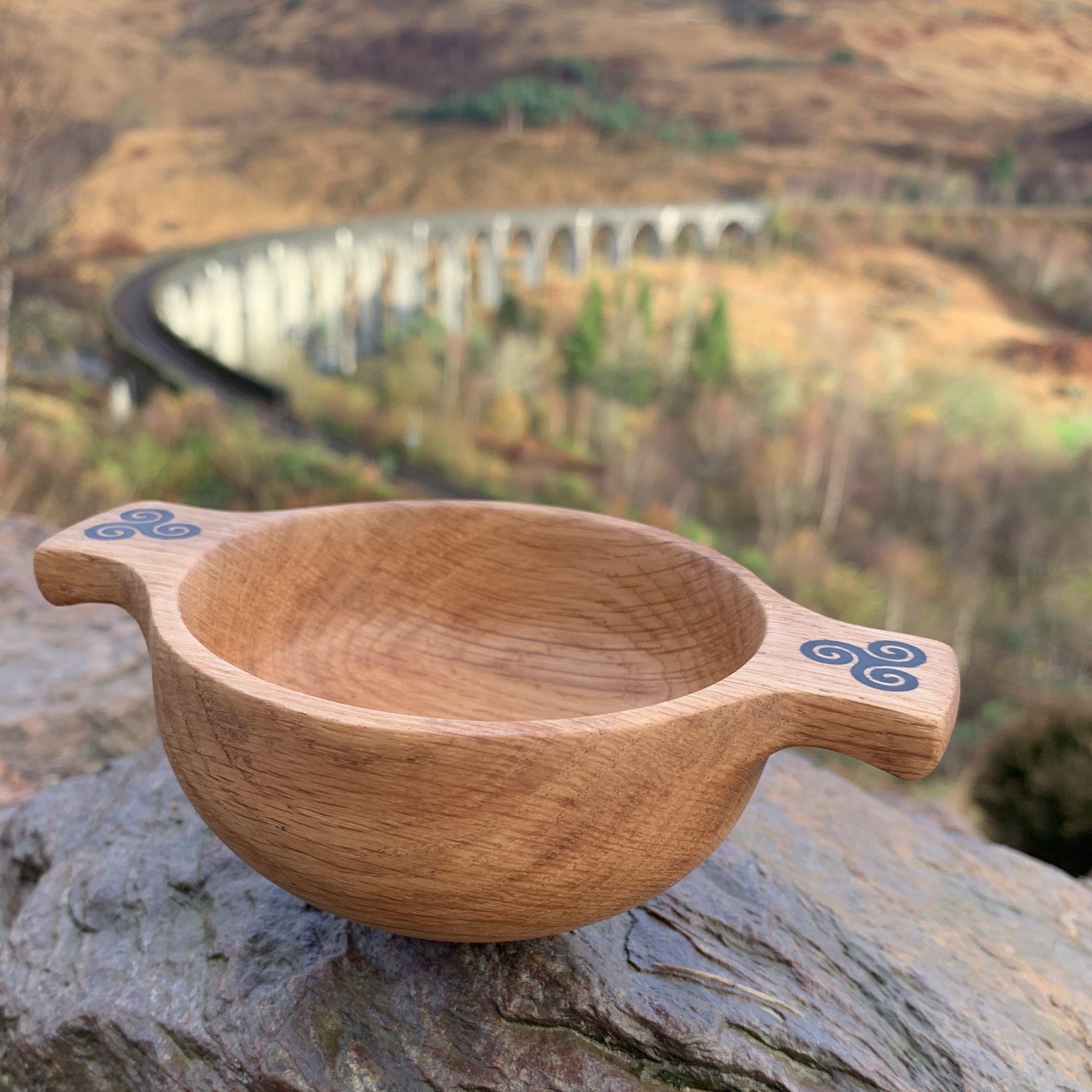 This traditional quaich has been cut from a beautiful single piece of locally sourced oak and professionally engraved and inlaid with a traditional Triskele design before being hand turned on a lathe. The quaich was then sanded and finished with pure tung oil, which is water proof, non toxic and food safe. A final coat containing natural wax and oil has then been applied to both protect and highlight the stunning grain.